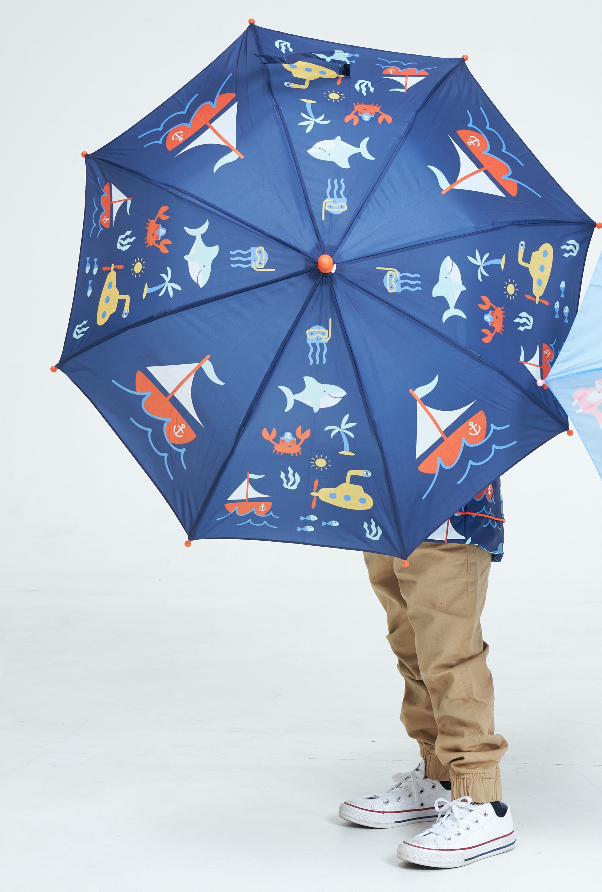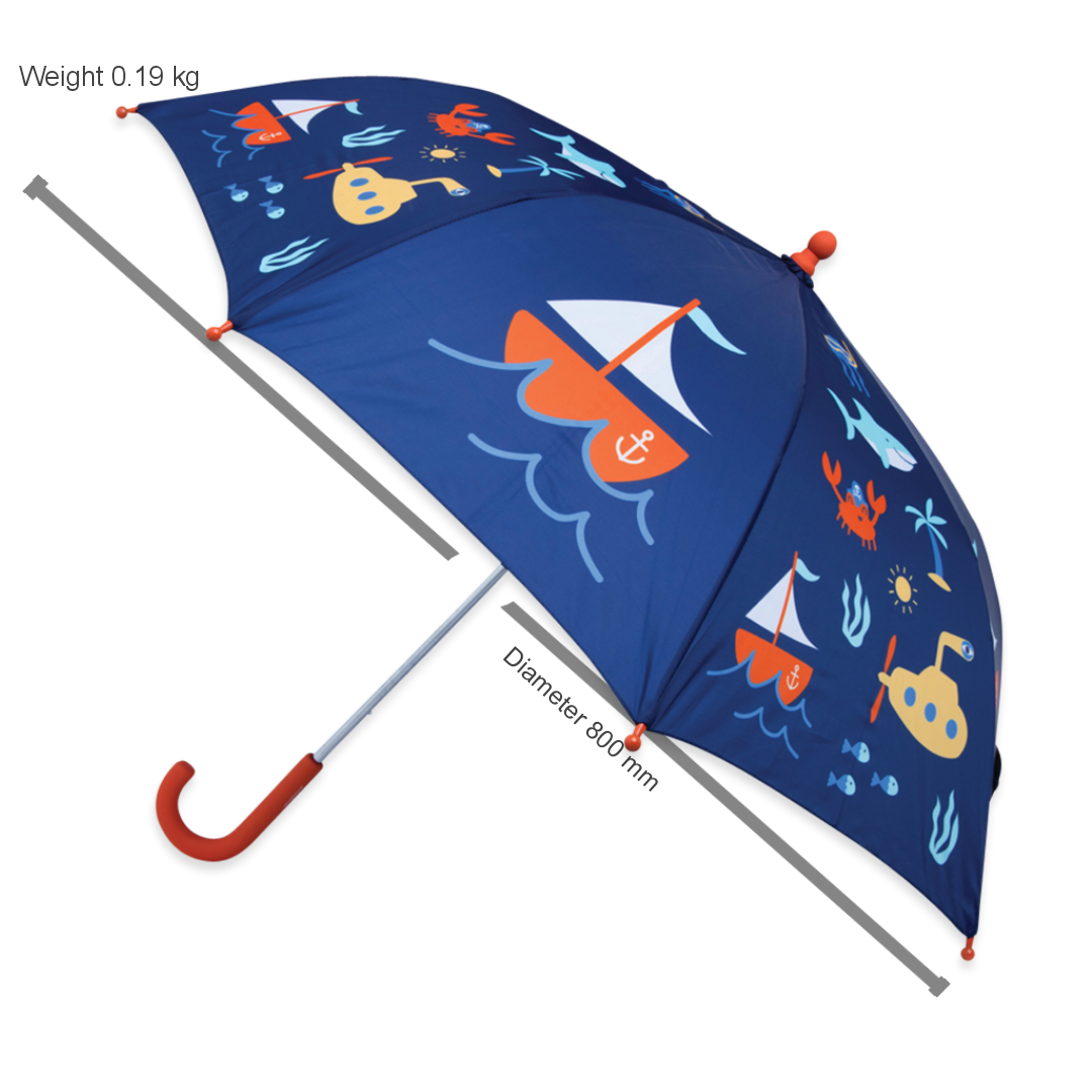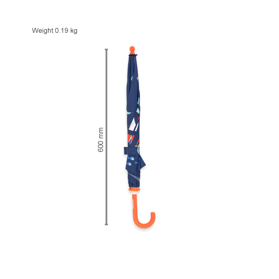 Rain, rain, go away, come again another day! Made with lightweight fibreglass spokes, a soft grip rubber handle, and a safety opening system to avoid pinching little fingers, our colourful Anchors Away umbrella for toddlers is the perfect accessory for cloudy weather. Make sure you pick up a matching Raincoat and Gumboots!