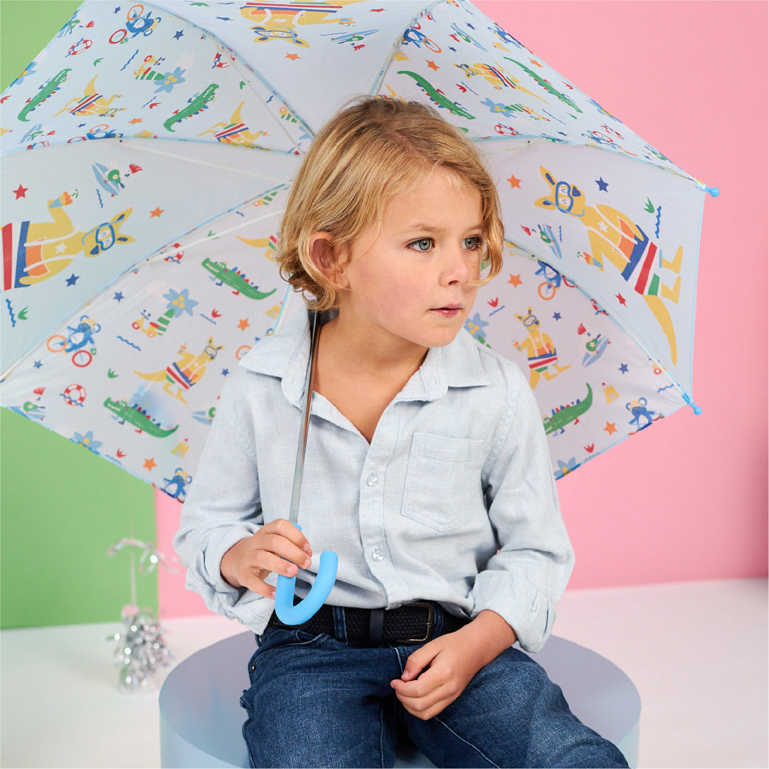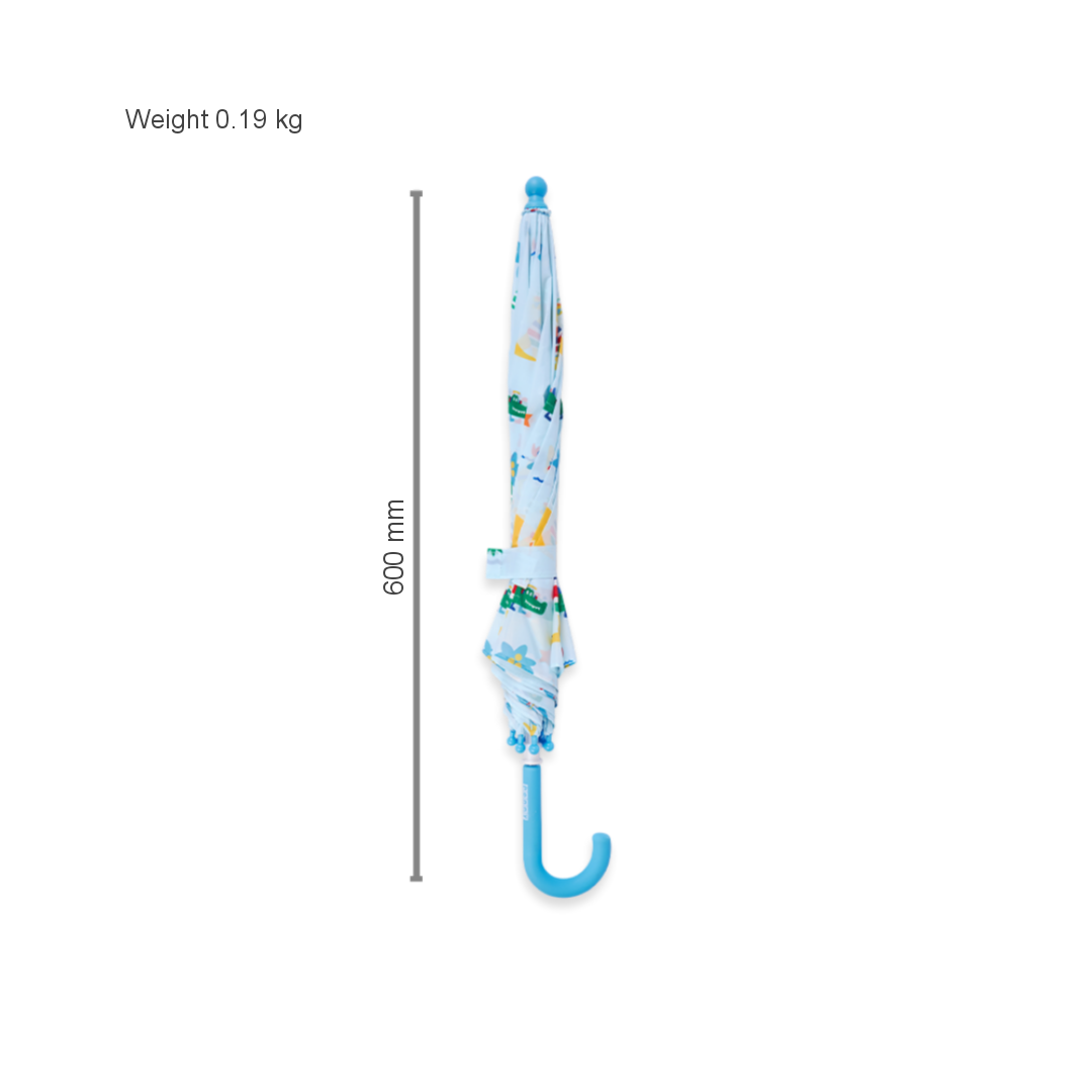 Rain, rain, go away, come again another day! Made with lightweight fibreglass spokes, a soft grip rubber handle, and a safety opening system to avoid pinching little fingers, our colourful Kanga Crew kids’ umbrella is the best accessory for cloudy weather. Make sure you pick up a matching Raincoat and Gumboots!